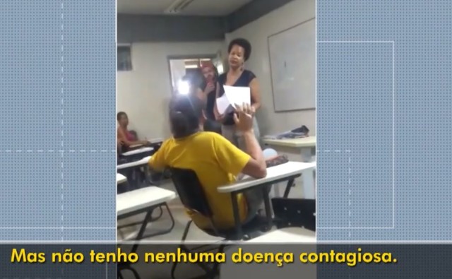 O vídeo ainda mostra que a coordenadora do curso fala para a professora que é um direito dela continuar na sala sem o aluno. “A senhora, professora, se sente confortável em condições de prosseguir a avaliação com o estudante na sala? Porque é seu direito [que ele saia da sala]”.