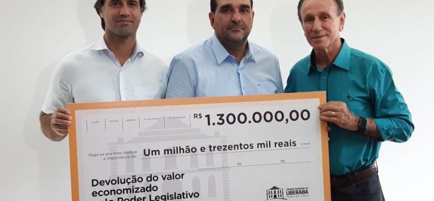 O prefeito de Uberaba, Paulo Piau (MDB), recebeu, nesta segunda-feira (30), um cheque simbólico de R$ 1,3 milhão do presidente da Câmara Municipal da cidade, Ismar Vicente dos Santos, o Ismar Marão (PSD).