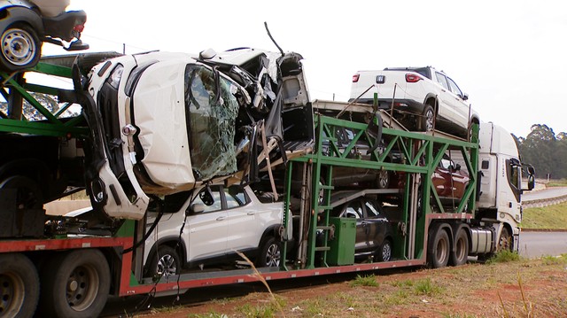 Uma caminhonete que era carregada pelo caminhão ficou dependurada na lateral do veículo e teve o teto arrancado.