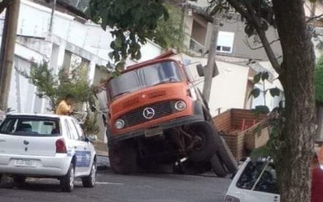 A imagem do veículo, conhecido popularmente como “tapa-buracos”, foi compartilhada por uma página no Facebook. A foto mostra o caminhão com a parte traseira dentro de um afundamento no asfalto.