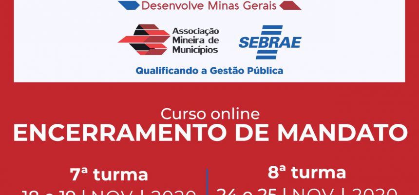 A Associação Mineira de Municípios (AMM) e o Serviço Brasileiro de Apoio às Micro e Pequenas Empresas (Sebrae) promovem mais duas turmas do curso sobre encerramento de mandato, de forma totalmente virtual, nos dias 18 e 19 (7ª turma) e 24 e 25 de novembro (8ª turma).