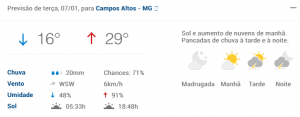 Ainda segundo o veículo meteorológico, amanhã (08) haverá sol com algumas nuvens e chuva rápida durante a tarde e a noite.