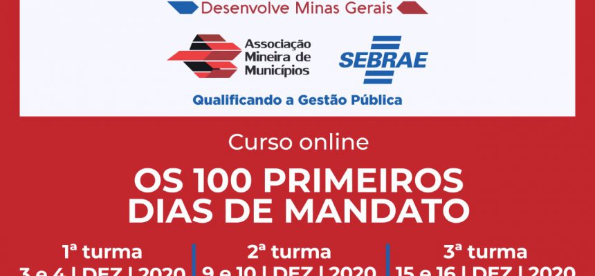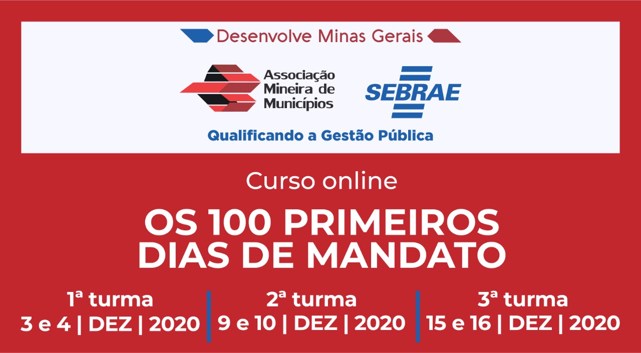 A partir do dia 1º de janeiro de 2021, os prefeitos eleitos assumem as prefeituras e enfrentarão os desafios que a administração pública municipal impõe, junto com toda a sua equipe administrativa. Para que os gestores compreendam melhor esse processo inicial e possam assumir os mandatos mais bem preparados, a Associação Mineira de Municípios (AMM) e o Sebrae Minas oferecem, por meio do projeto Desenvolve Minas Gerais, três edições virtuais do curso denominado “Os 100 primeiros dias de mandato”, nos dias 3 e 4, 9 e 10 e 15 e 16 de dezembro. As inscrições são gratuitas e estão abertas aos gestores e servidores públicos municipais. Clique aqui e acesse.