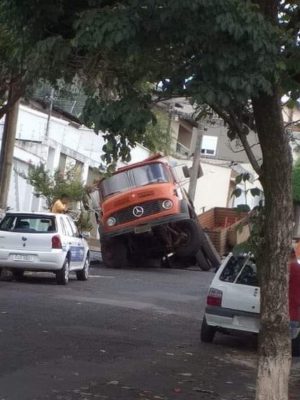 Caminhão tapa-buracos fica preso em buraco