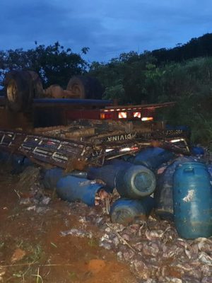 Caminhão carregado de carcaça de peixe tomba na MGC-462, em Patrocí