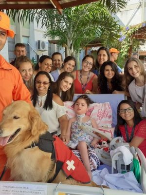 Menina de 6 anos que vive em hospital toca em cachorro pela primeira v