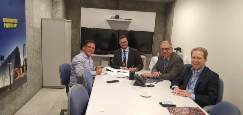 O contrato foi assinado pelo prefeito Olívio Teixeira e os representantes da Caixa, Emerson Leal, Superintendente de Rede, Marcelo Baião, Superintendente de Governo e Heberth Percope, Gerente de Governo.