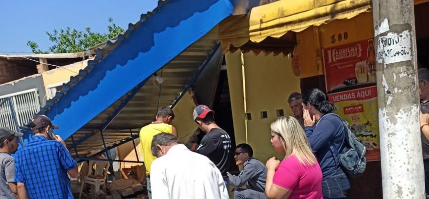 No local constataram que enquanto algumas pessoas estavam colocando um toldo em frente uma edificação a estrutura onde estava afixada o toldo, na parede próximo ao telhado, não resistiu ao peso e caiu. Embaixo do local estavam algumas pessoas e 04 delas tiveram ferimentos e receberam os cuidados da guarnição.