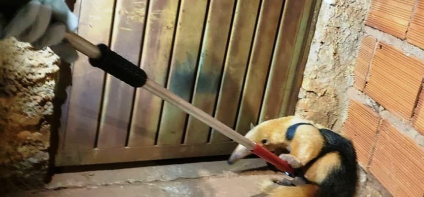 Com técnicas de salvamento terrestre, o Corpo de Bombeiros realizou a captura segura do tamanduá enquanto ele caminhava pelos terrenos em direção à casa vizinha.