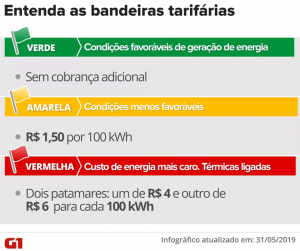 O sistema de bandeiras tarifárias (veja abaixo) sinaliza o custo de geração de energia. O objetivo é informar aos consumidores quando esse custo aumenta e permitir que eles reduzam o uso para evitar pagar uma conta de luz mais cara.